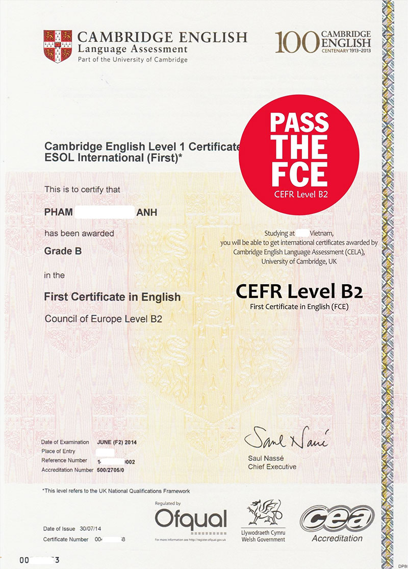 - Chứng chỉ FCE – First Certificate in English: là chứng chỉ ở cấp độ Trung cấp, tương đương với cấp độ B2 của Châu Âu. FCE có thể được sử dụng để đi làm hoặc đi học ở nước ngoài.