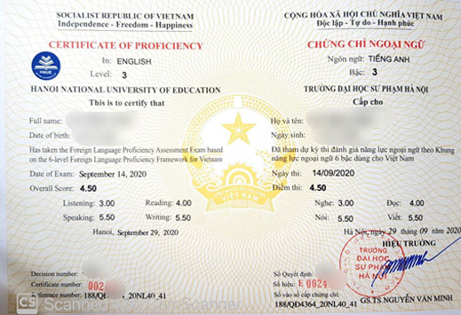 Mẫu chứng chỉ Khung NLNN 6 bậc dành cho Việt Nam.