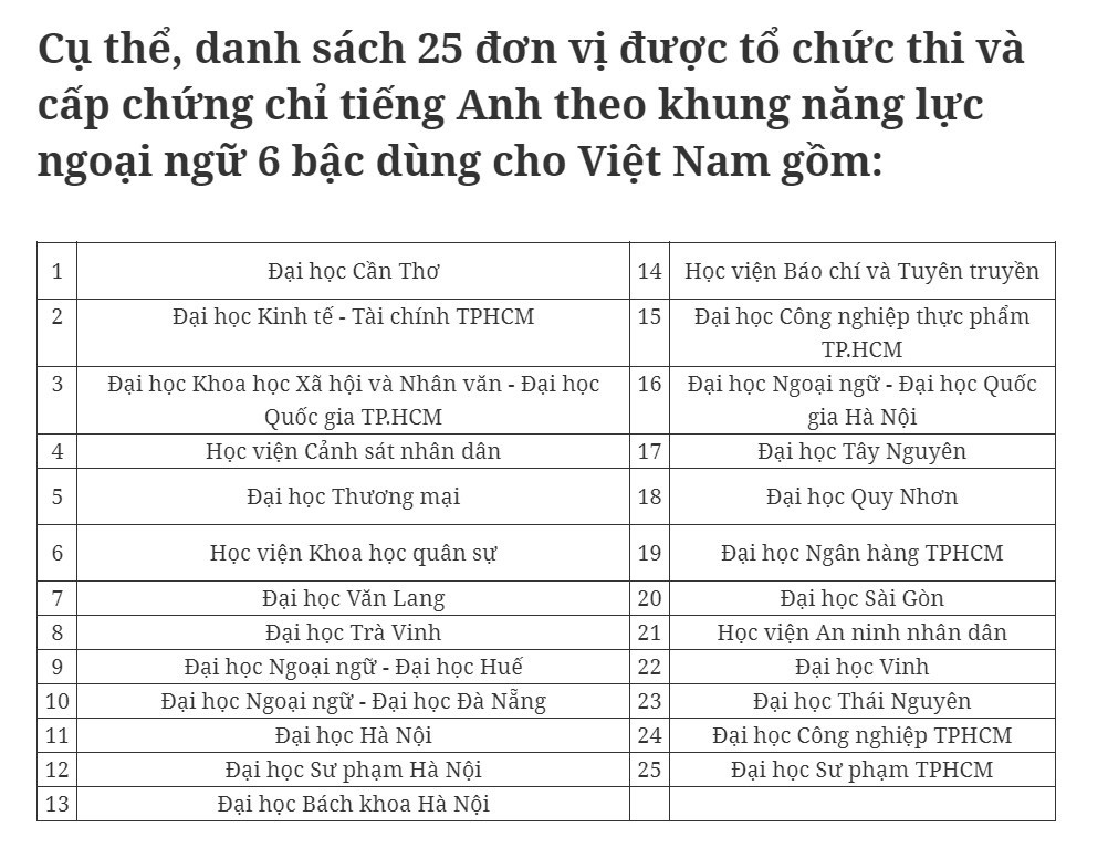 - Chứng chỉ khung năng lực ngoại ngữ 6 bậc dành cho Việt Nam (Bậc 1 đến Bậc 6 và tương thích với các bậc từ A1 đến C2 trong CEFR).